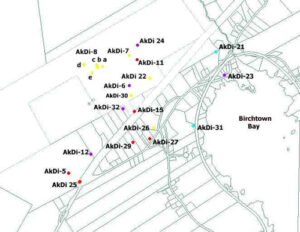 1995 – Lead by Laird Niven – testing on sites AkDi 16 to 21. AkDi 16 was noted in the 1994 survey, but was not recorded. After tests were complete, results were inconclusive. Further recording resulted in identifying 5 previously unknown sites – AkDi 17 to 21. The most significant of these was an unusual group of rock features located near the heart of Birchtown – later to become known as the Mysterious Mounds.